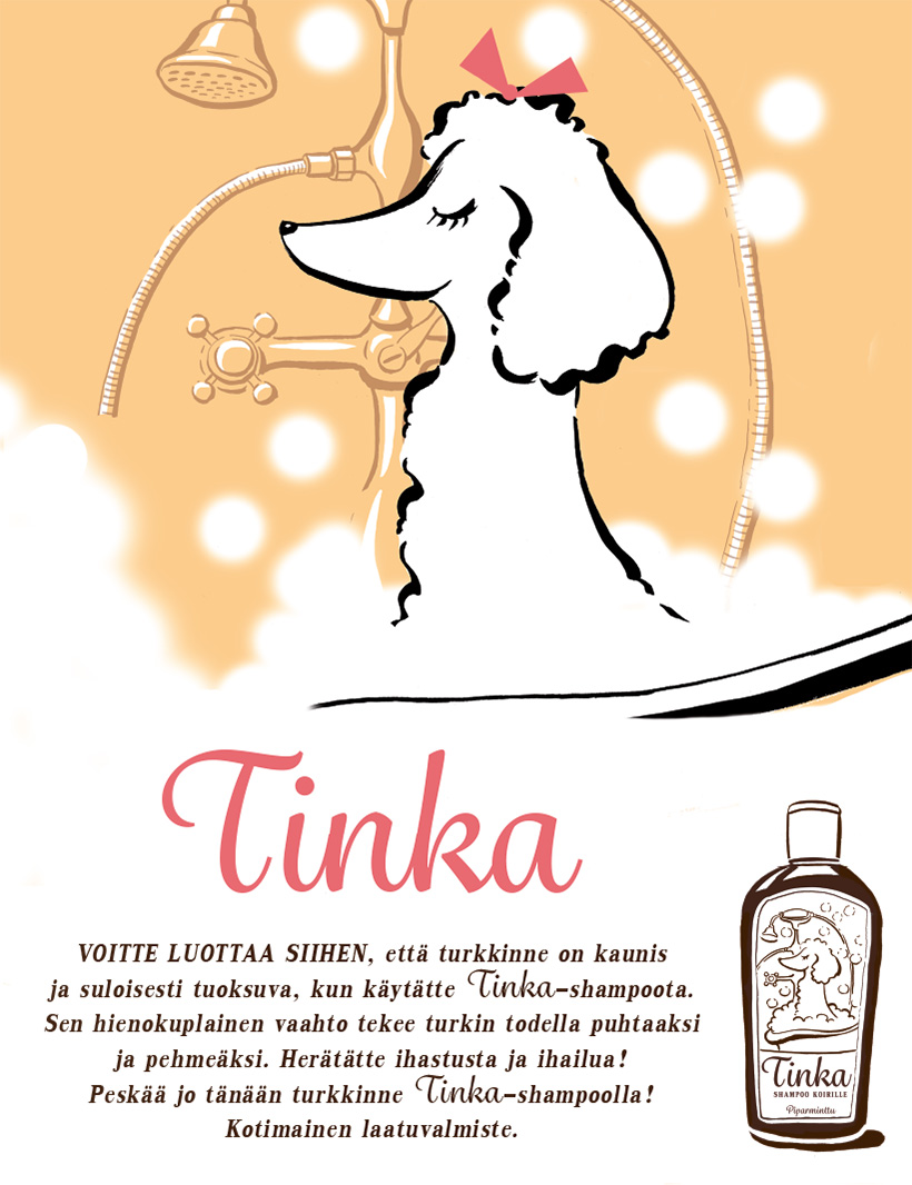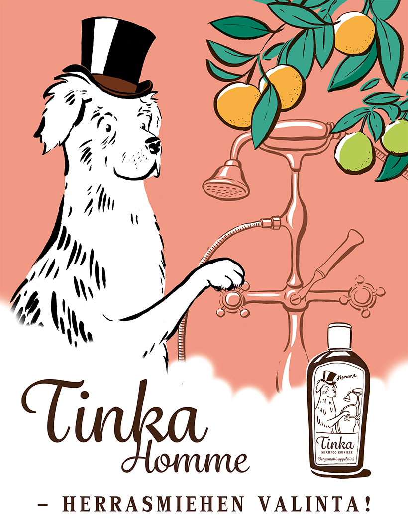 Tinka on suloisesti tuoksuva pesuaine kaikenkarvaisille koirille. Sen hienokuplainen vaahto pesee turkin puhtaaksi, kiiltäväksi ja hyvän tuoksuiseksi. Huolella suunniteltu koostumus on kasvipohjainen ja hajoaa luontoon sitä kuormittamatta. Shampoot eivät sisällä luontoa vahingoittavia kemikaaleja, kuten fosfaatteja, zeoliittia tai petrokemian raaka-aineita.